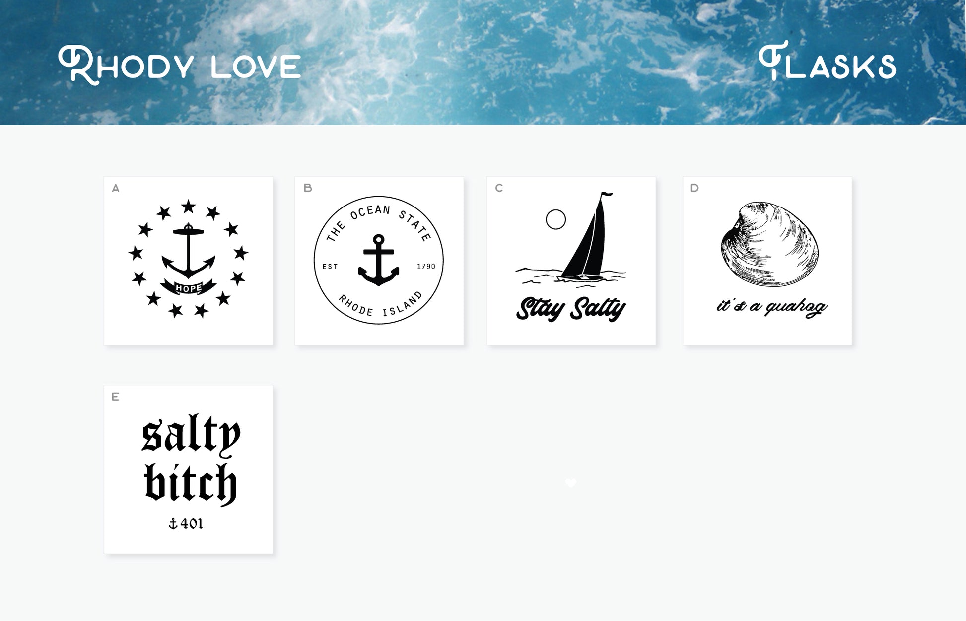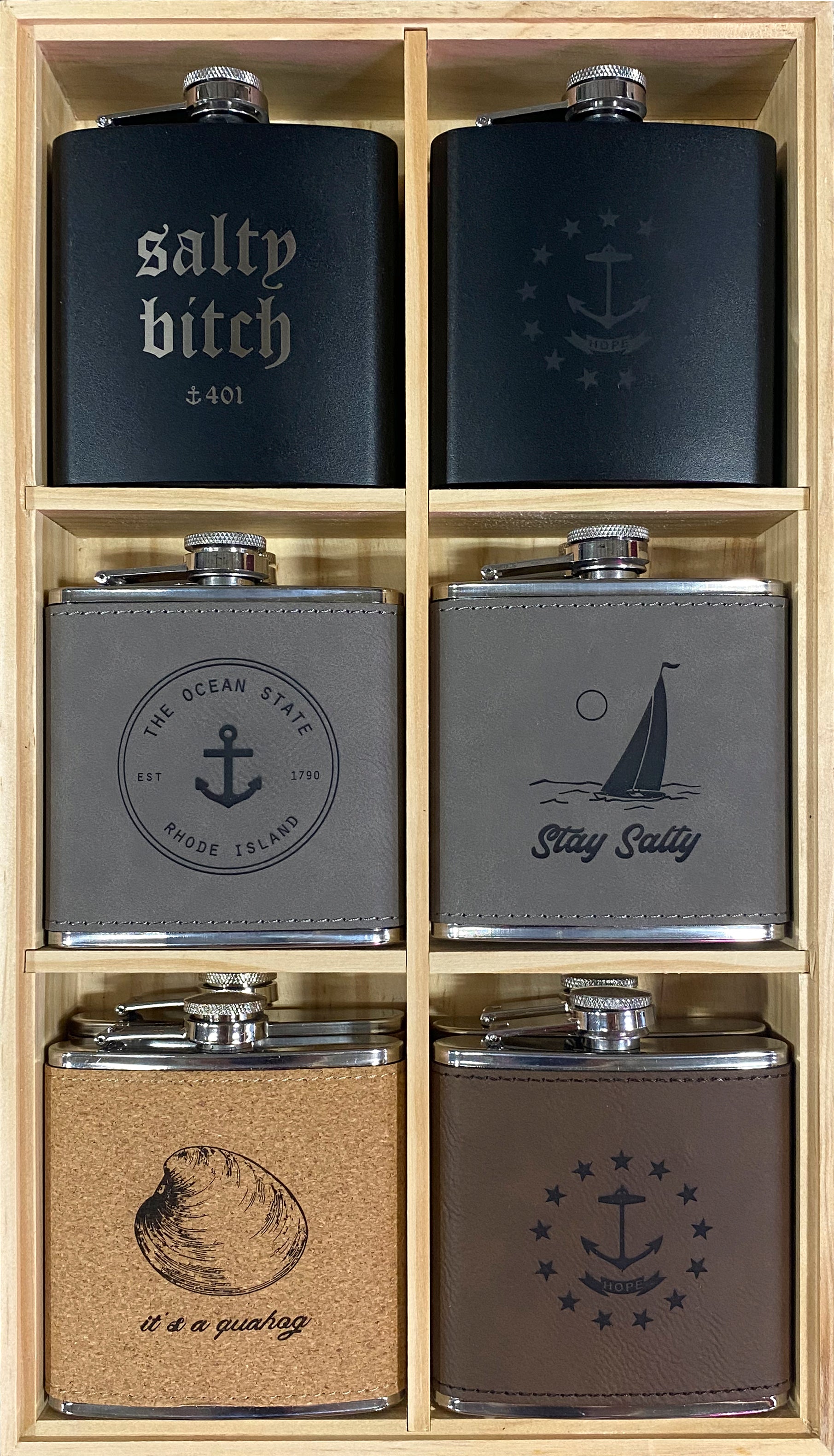 Stainless Steel 6oz flasks available in a variety of colors with your choice of Rhody design.