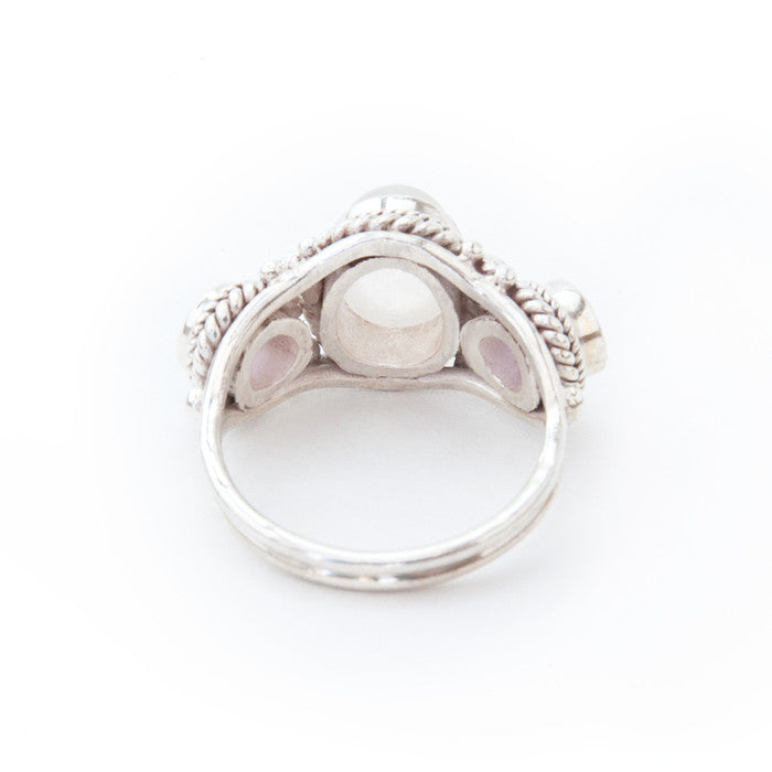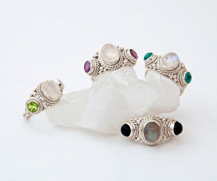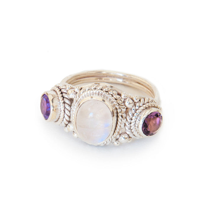 Beautiful multi-stone ring with two polished and cut amethyst stones framing a center glowing moonstone. Entirely handmade detailed bezel setting.