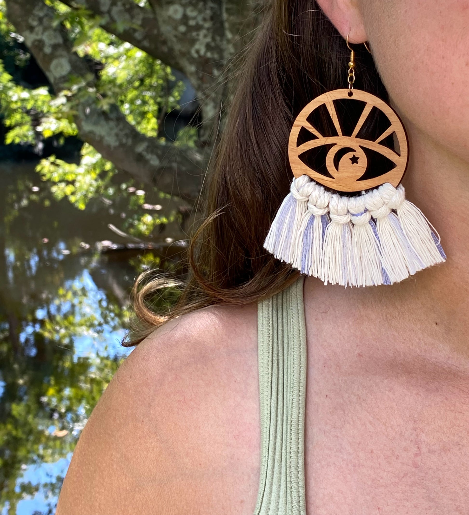 Wooden portion for all Bright Eyes earrings diameter measures 5.1 cm, length of Macrame varies