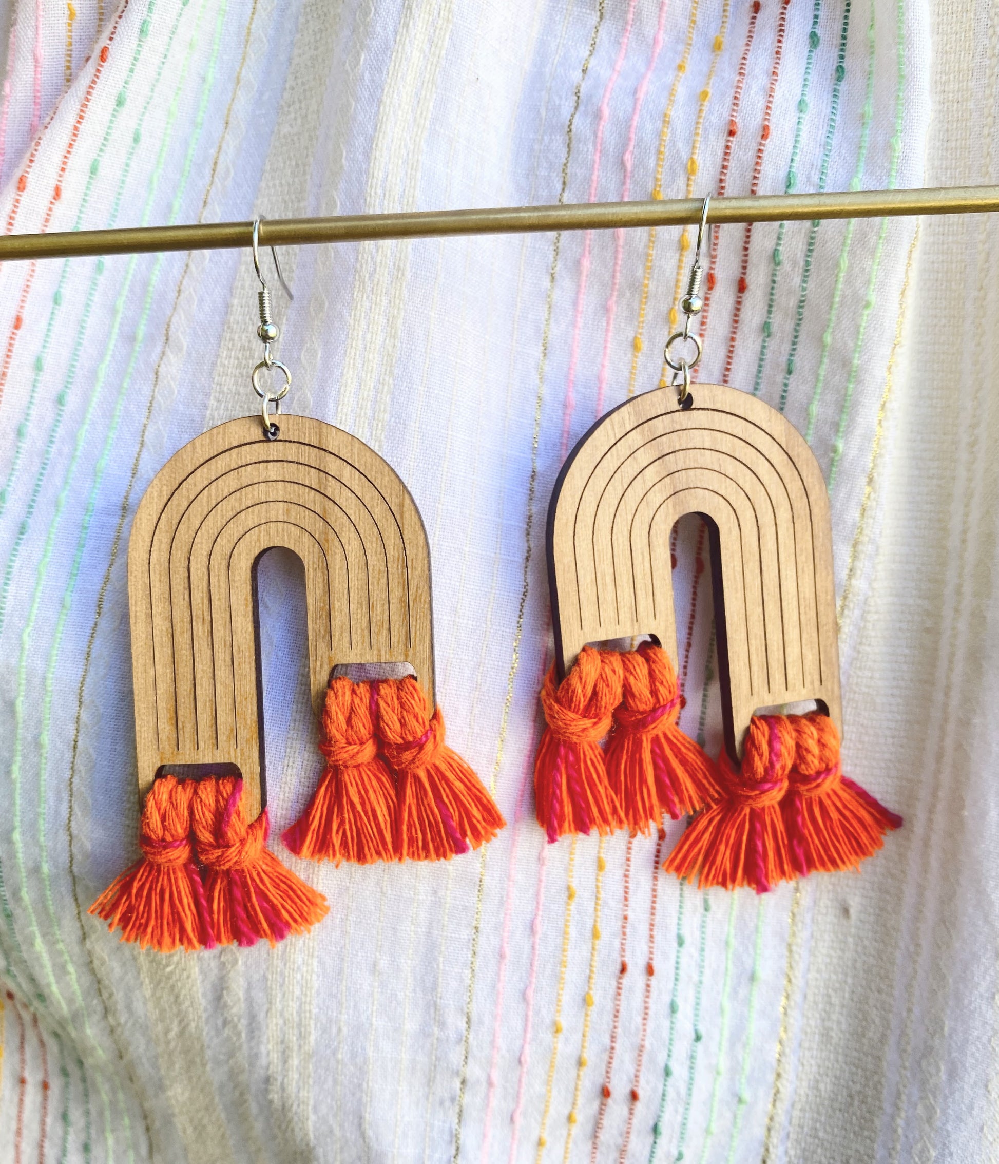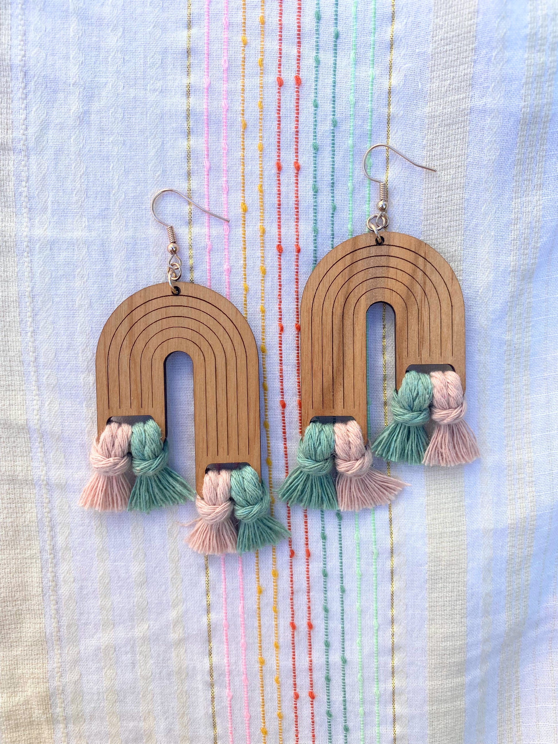 Wooden portion for all Double Rainbow earring 1.5" x 2.12", length of Macrame varies.