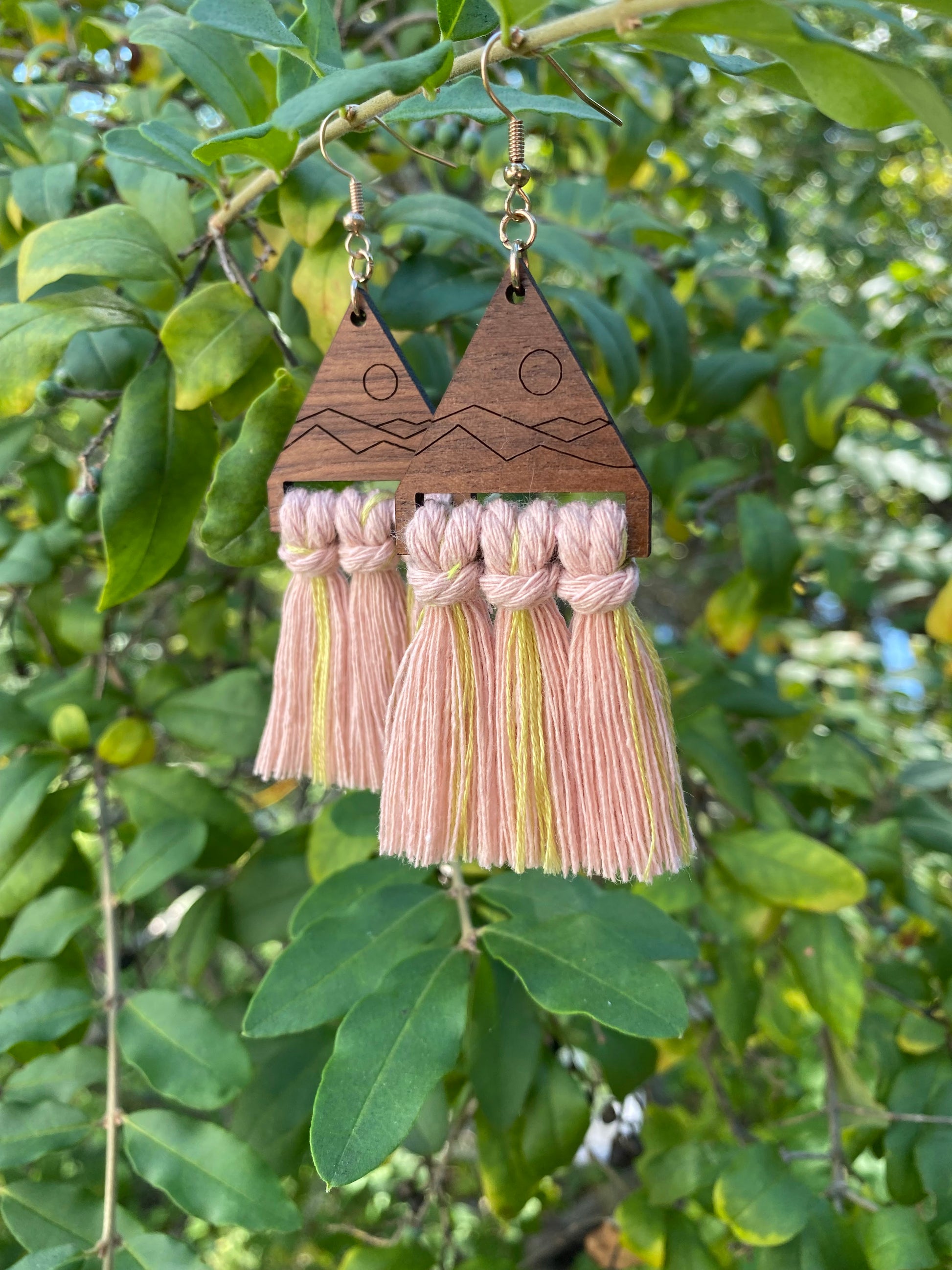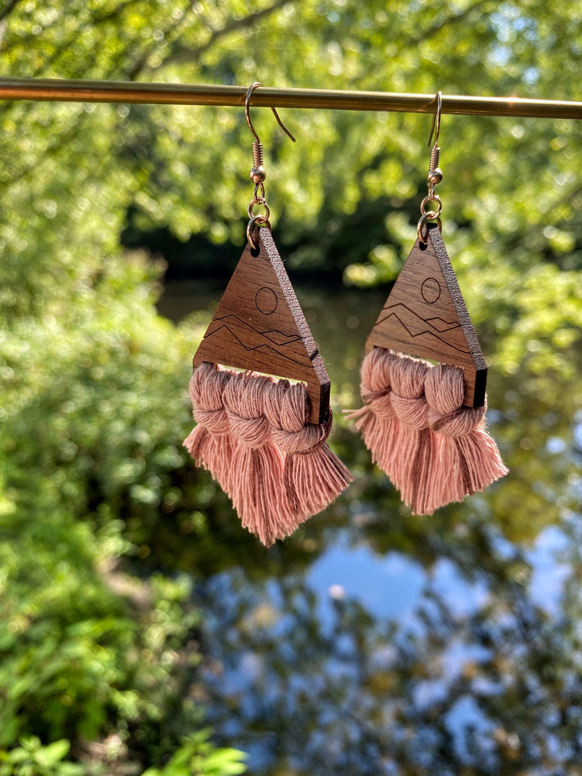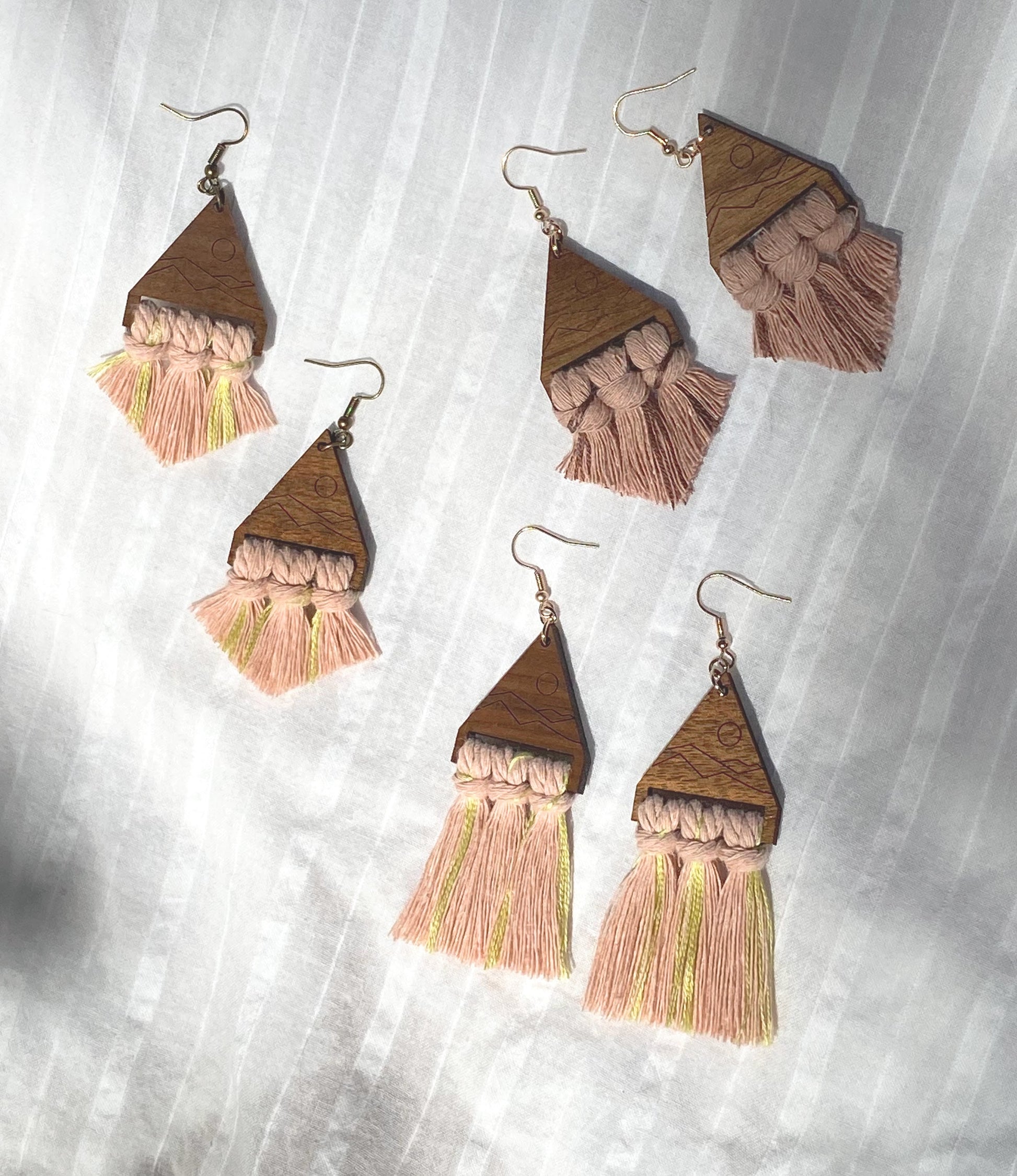 Wooden portion for all Mountain earrings measure 3cm wide x 3.2cm, length of Macrame varies.